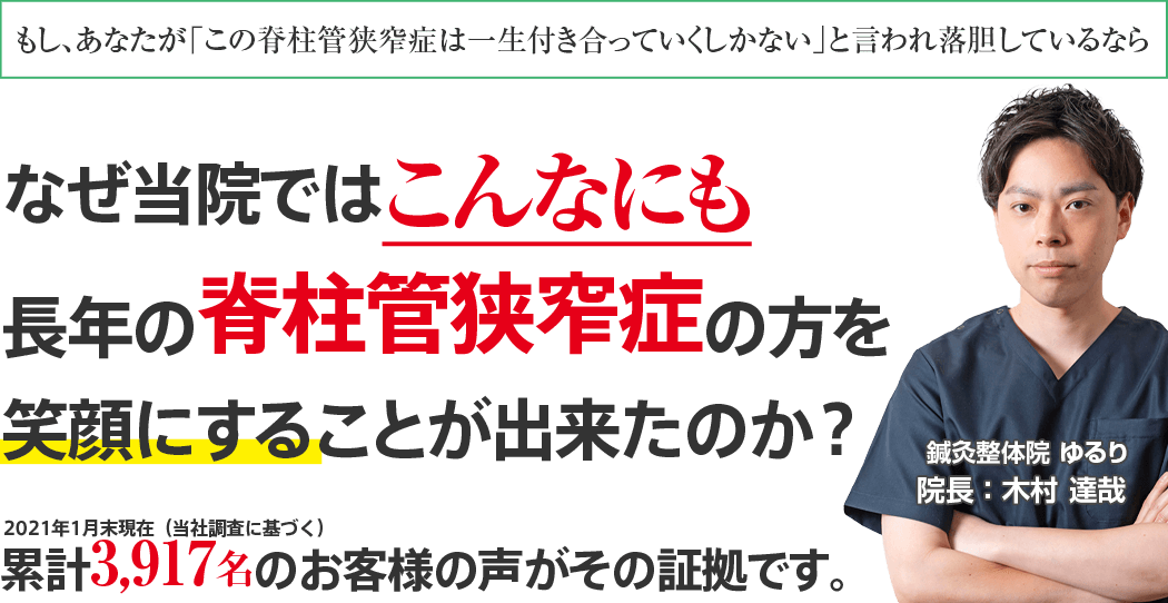 多くの方は、その最初の一歩を踏み出さない事で、結局ずっと脊柱管狭窄症に悩まされながら生活を送 ってしまいます。あなたもこのままその辛い脊柱管狭窄症を抱えたまま過ごしていきますか?